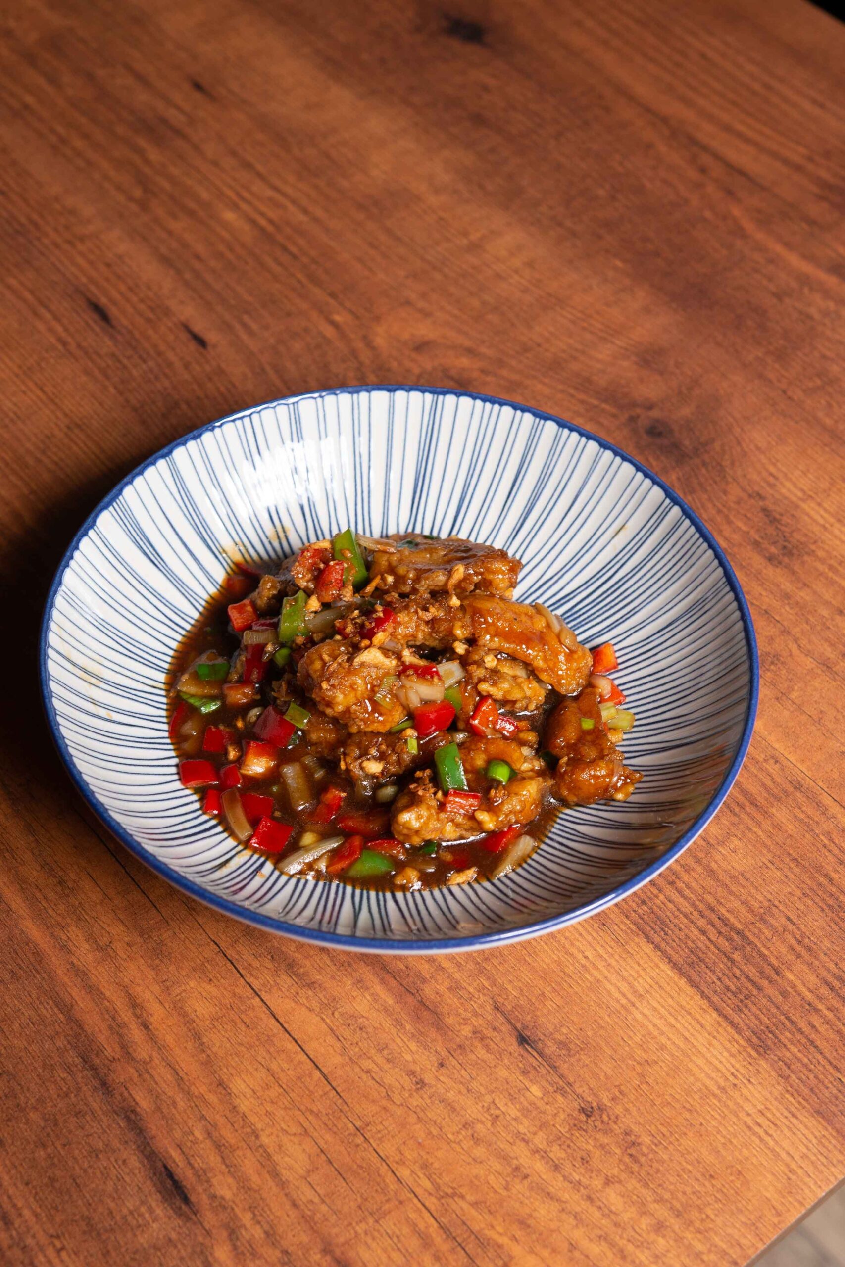 File de șalău, usturoi, sos de soia, sos de stridii/castraveți, ananas, roșii, ardei roșu, ardei verde, ceapă albă și ceapă verde, sos dulce acrișor.