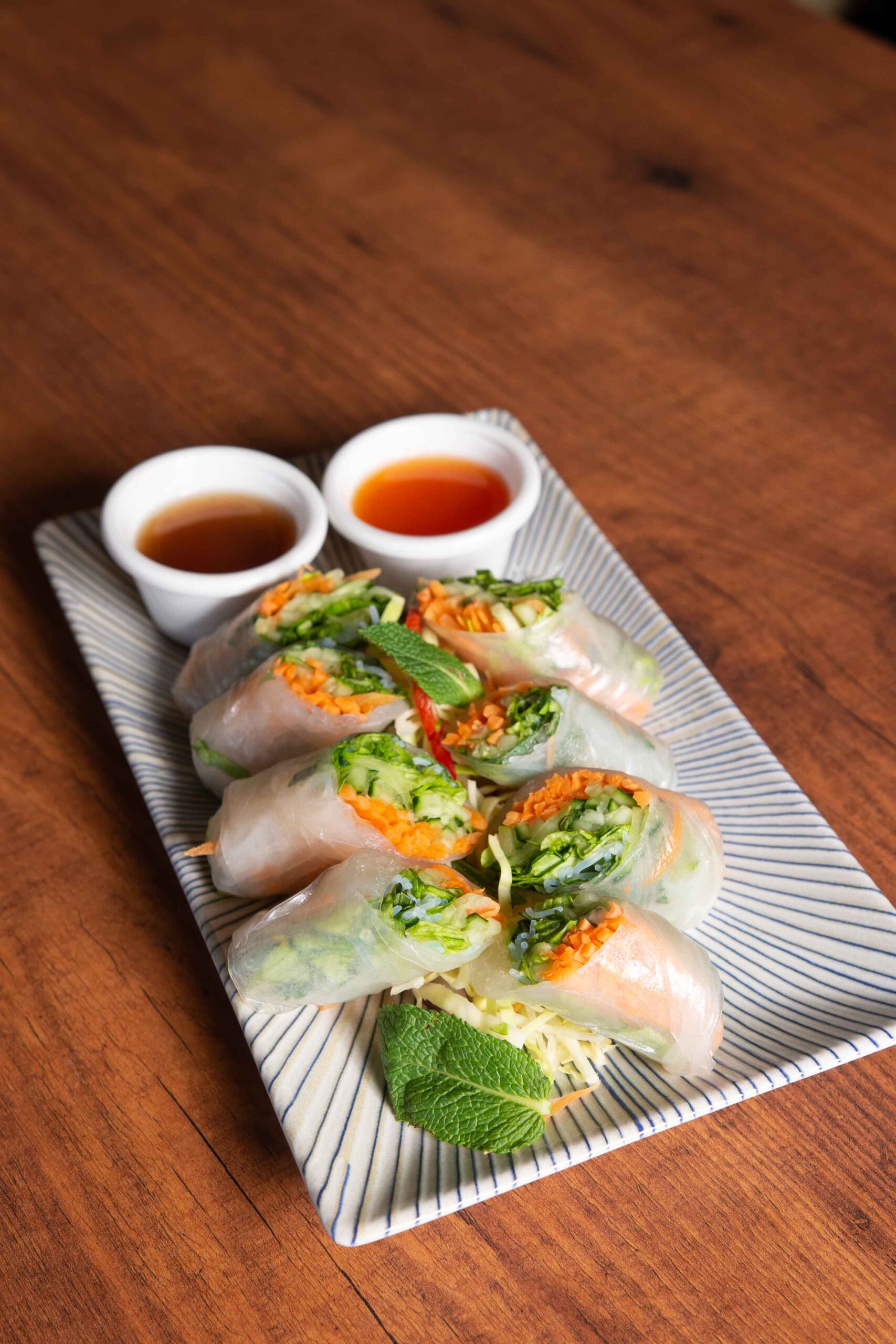 Salată verde, coriandru, morcovi, castraveți, mentă, tăiței vermicelli/ creveți. Sunt acompaniate de sos de prune și sos sweet chilli.
