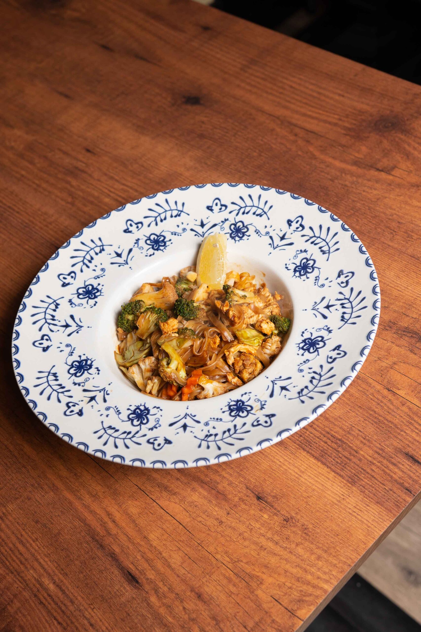 Tăieței de orez, broccoli, conopidă, morcovi, varză albă, zahăr, sos soia, (ou) 200g Alergeni: 3, 6