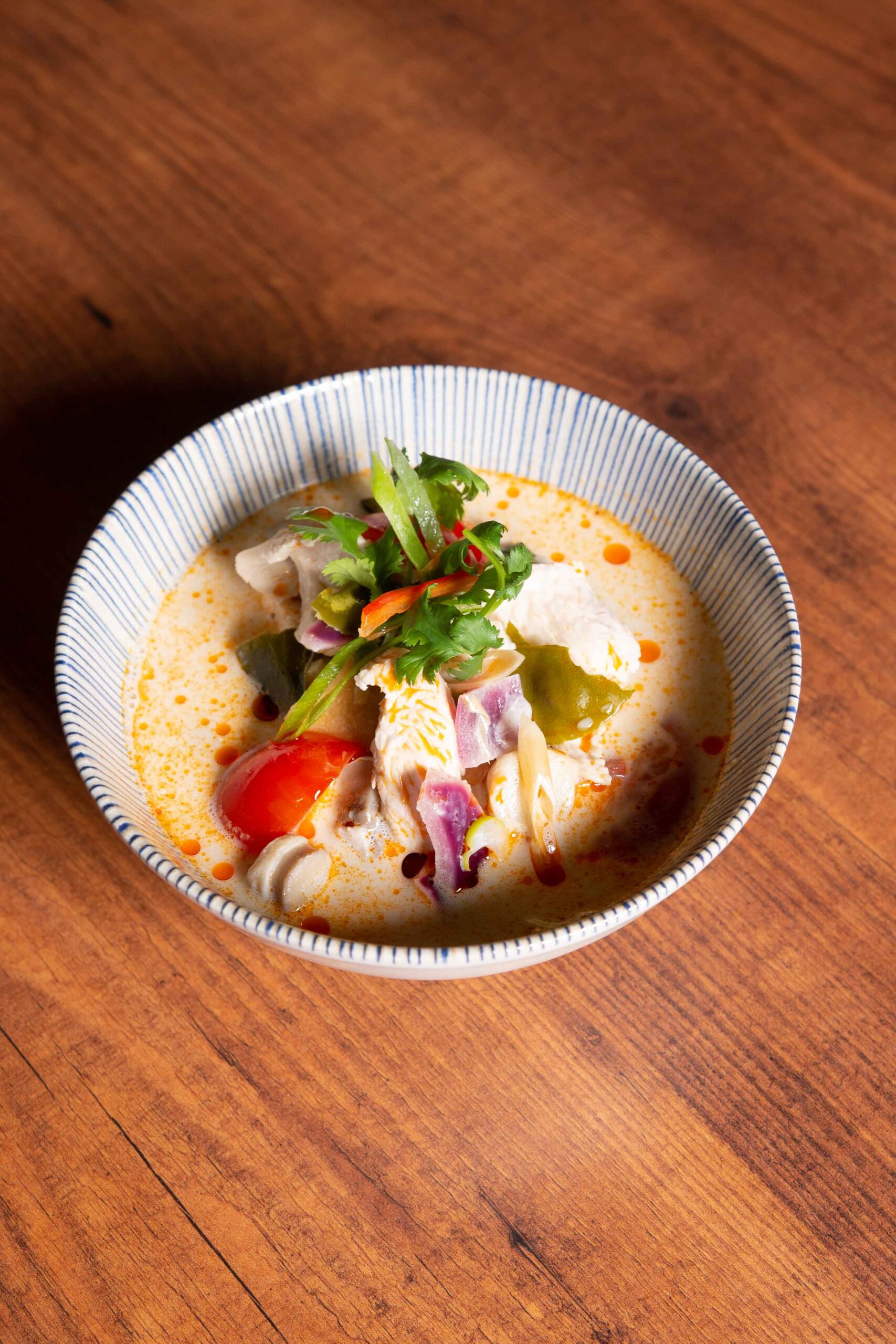 Carne de pui, lapte de cocos, lemongrass, galangal, kaffir lime, ceapă roșie, ceapă verde, ciuperci, suc de lime, coriandru, sos de pește, zahăr de -palmier. GLUTEN FREE 300g Alergeni: 4